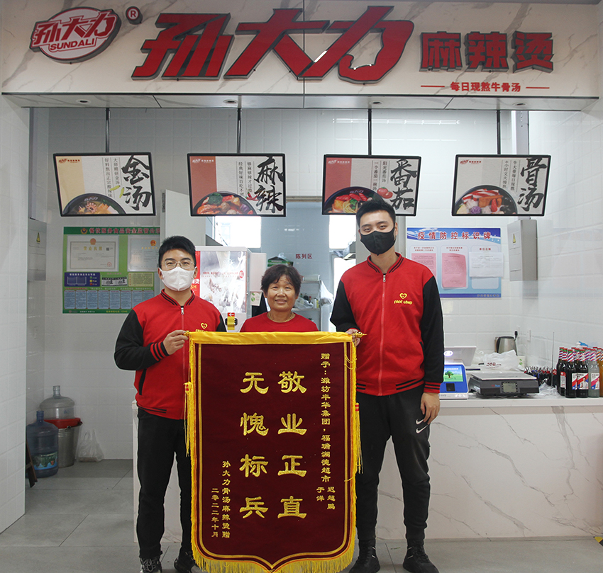一心一意做服務(wù),細(xì)節(jié)之中見(jiàn)初心。10月27日,二樓商戶孫大力骨湯麻辣燙老板手指受傷無(wú)法到店,僅剩兩位老人在店經(jīng)營(yíng),因年紀(jì)大不會(huì)使用收銀系統(tǒng),無(wú)法收款。于洋和遲超鵬得知該情況后主動(dòng)擔(dān)當(dāng)每天中午幫商戶收款,使其能夠正常經(jīng)營(yíng)。11月2日,二樓商戶孫大力骨湯麻辣燙為Free Land送來(lái)了錦旗。一是對(duì)此事表示感謝,二是對(duì)Free Land主動(dòng)幫助商戶送餐、充電充水、有問(wèn)題及時(shí)對(duì)接解決等日常服務(wù)工作表示肯定。截至發(fā)稿日期,F(xiàn)ree Land仍在堅(jiān)持每日中午幫助該業(yè)戶收款,真正將全心全意服務(wù)的宗旨和初心做到了實(shí)處。